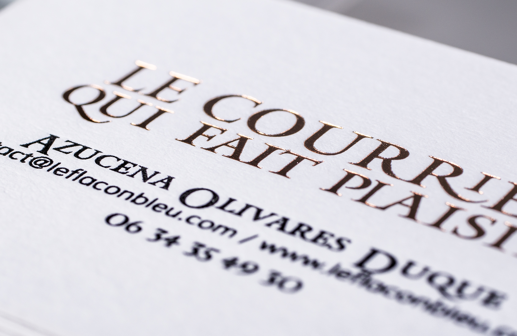 Impression monochrome Recto/Verso accompagnée d’une dorure à chaud cuivre sur leVerso. Imprimées sur papier G.F Smith Colorplan Bright White Dapple 700g.