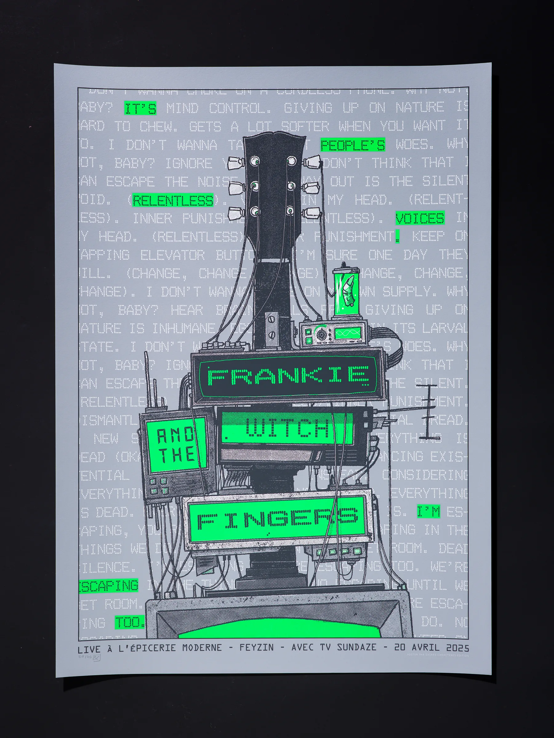 Concert à L’Épicerie Moderne – 2025 Sérigraphie 3 couleurs sur Procop Fedrigoni Arena 300g 50×70 cm / 19.7×27.5″ Édition de 40 exemplaires Numéroté et signé.