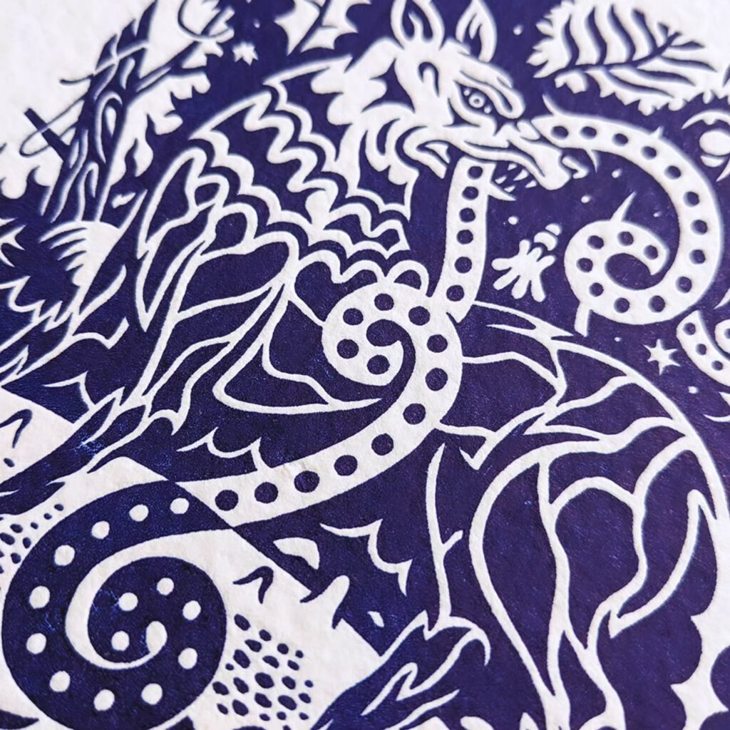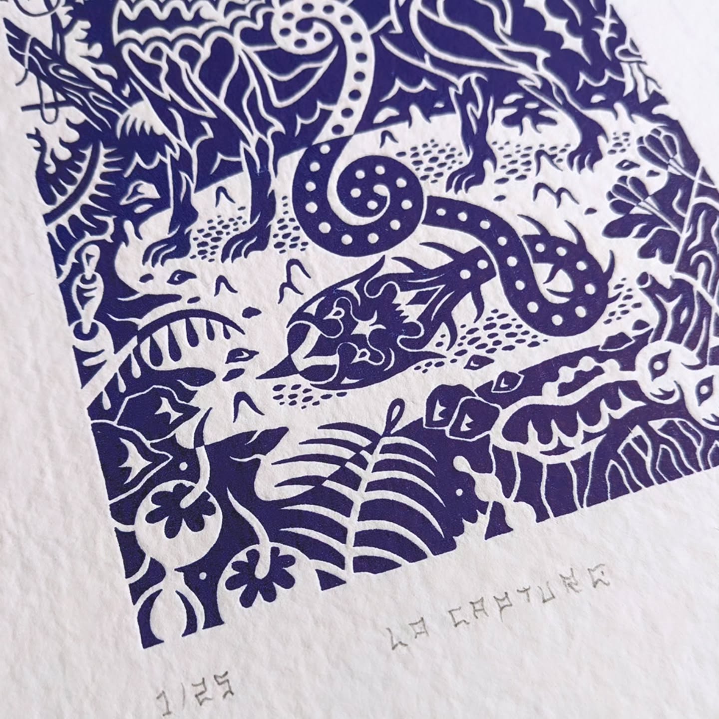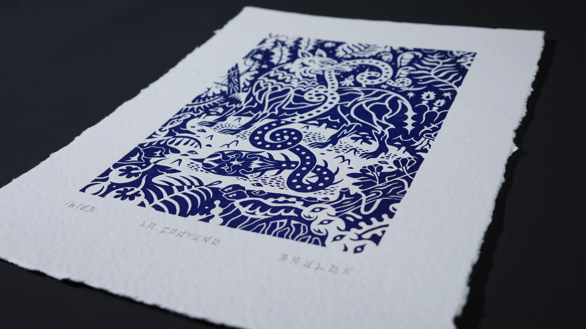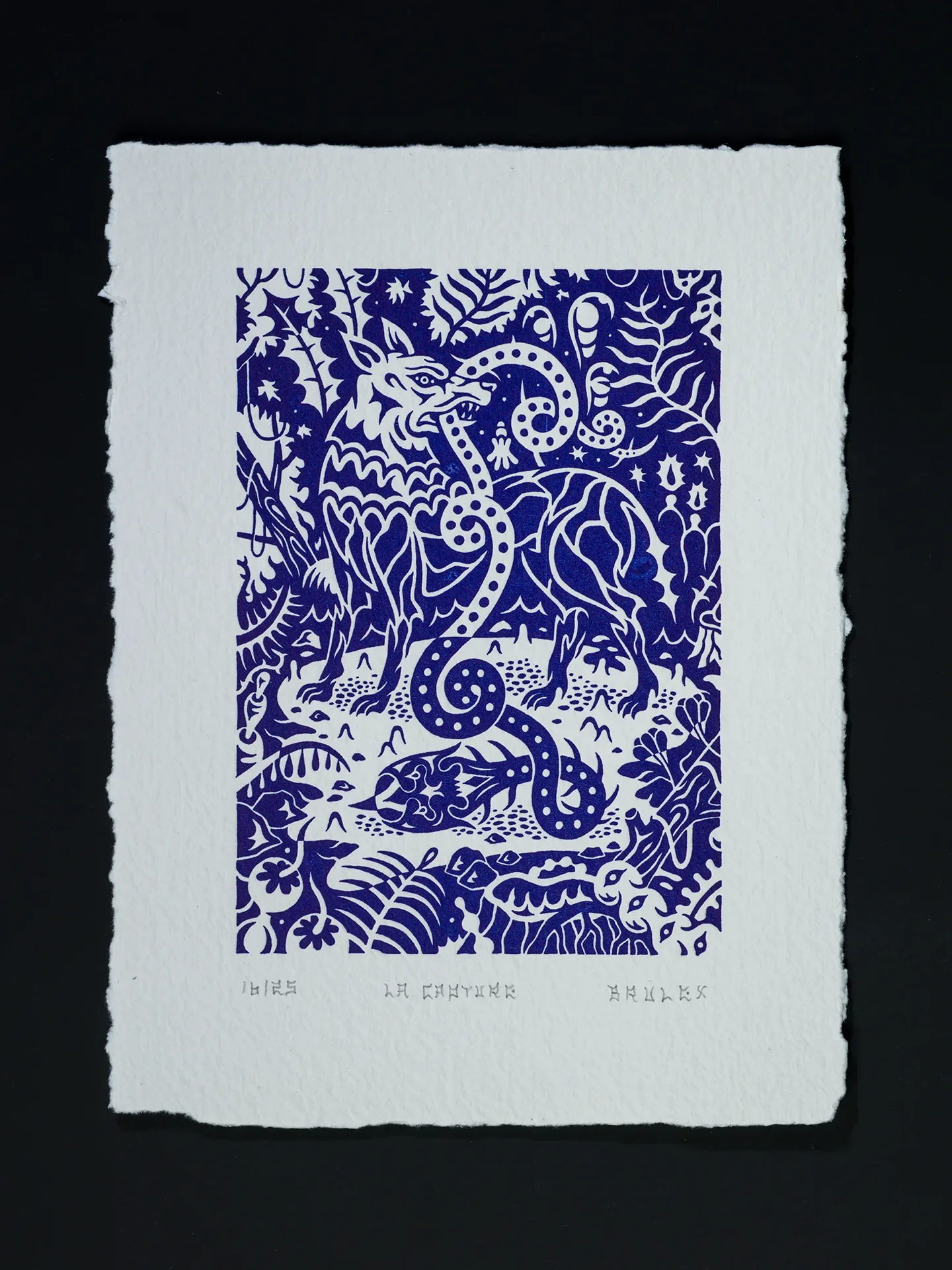 Une impression monochrome d’un bleu profond réalisée sur papier chiffon artisanal 300g.